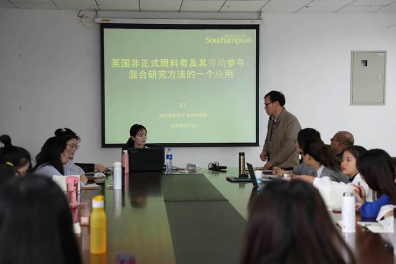 讲座的最后一部分是混合研究方法的具体应用。王宁研究员介绍了“英国非正式照料的提供和中年照料者经济活动的减少”这一研究,其数据来源于NCDS第八期和第九期的数据,研究样本是50—55周岁的中老年人。研究的主要目的在于探讨影响中年照料者减少经济活动的因素,透过文化视角、照料负担视角、社会经济和人口统计学视角以及制度主义视角分析这一问题。王宁研究员指出,这项研究在理解照料者减少经济活动方面增加了另外两个视角:社会身份以及生命历程事件。最后针对研究结果给出了一些政策建议,认为在获取卫生服务方面提供更多的支持,以及更多的财政支持可能是维持其长期护理贡献的关键。