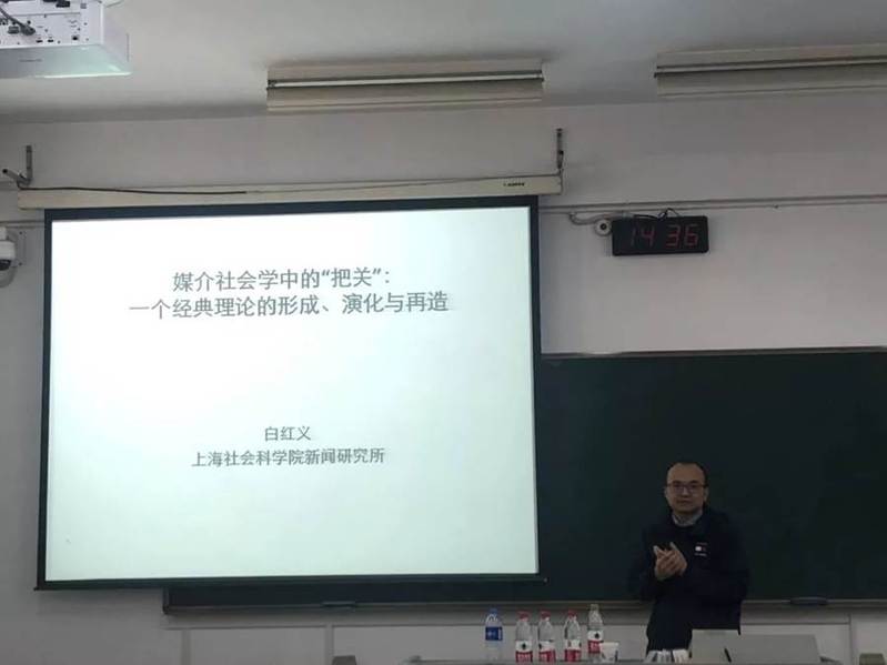 白老师介绍了他在这方面的研究成果。他首先界定了“把关”概念。“把关”是挑选、写作、编辑、定位、安排调度、重复或者修改那些即将成为新闻的信息的过程,是对信息流动过程的一种隐喻式表达,其中提及的关卡、渠道等并不真实存在。在新的媒介环境下,新闻业的现实发展促使我们重新审视、重新评估和重新思考数字时代的把关过程。