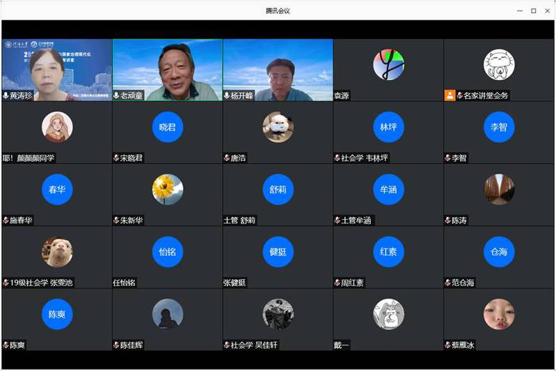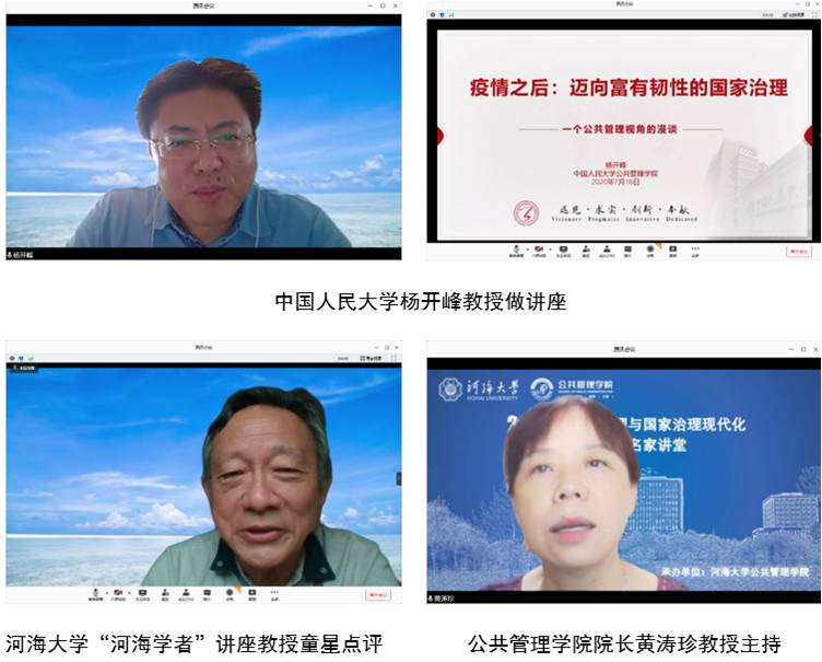 7月31日,“应急管理与国家治理现代化”云端系列名家讲堂第四讲如期举行。中国人民大学williamhill经理、全国公共管理专业硕士(MPA)教育指导委员会秘书长、中国管理现代化研究会公共管理专业委员会副理事长、中国机构编制管理研究会副会长、中国行政管理学会常务理事、美国国家行政科公司院士杨开峰教授以《迈向富有韧性的国家治理》为题,为河海师生带来了一场精彩的学术报告。南京大学社会风险与公共危机管理研究中心主任、williamhill威廉希尔“河海学者”讲座教授童星特邀点评。威廉希尔经理黄涛珍教授主持报告会。近300名师生认真聆听了报告。