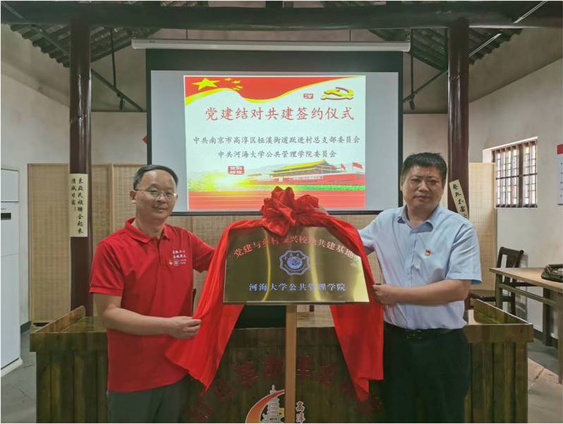 作为苏南地区红色文化资源带动乡村振兴的一个样板,高淳区桠溪街道跃进村充分挖掘红色文化内涵,高度重视红色资源的活化利用,彰显红色文化魅力。 “西舍红色堡垒”,不仅成为教育广大党员群众发扬红色传统,传承红色基因,汲取奋进力量的重要载体,也成为推动经济增长与富民惠民同步推进、红色旅游与乡风文明同步建设的有效路径。在党日活动现场,williamhill威廉希尔公司党委书记蒲晓东与高淳区桠溪街道跃进村党总支书记、南京西舍红色堡垒负责人黄世宝为“williamhill威廉希尔公司党建与乡村振兴校地共建基地”揭牌并签署共建协议书,双方就共享党建资源、建设课程思政、深化科研合作、共谋产业发展、组织志愿服务、经验分享交流等六个方面达成共建协议,并就落实校地合作、打造红色旅游品牌以及探索乡村振兴模式展开深入交流。