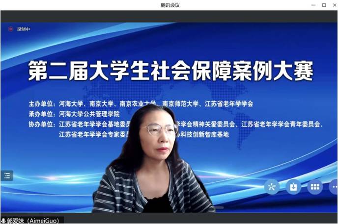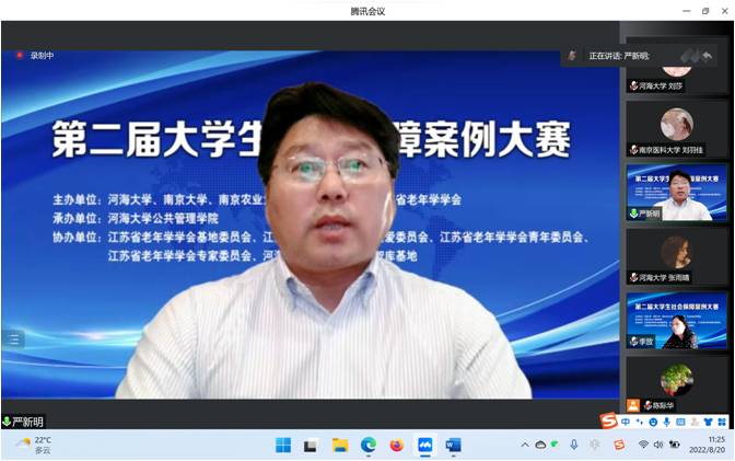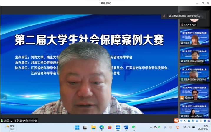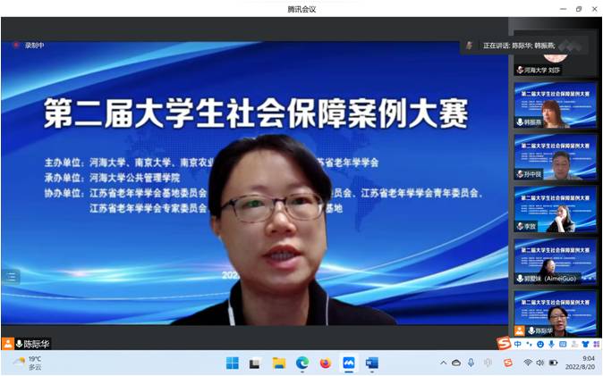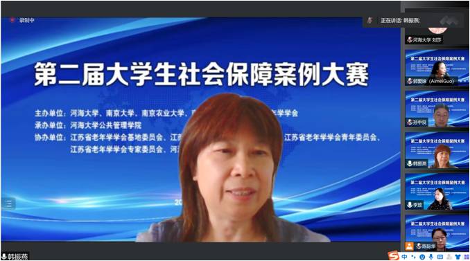 为积极应对人口老龄化国家战略,推动新时代社会保障高质量发展,加强校企合作,提升劳动与社会保障及相关专业老员工的理论基础、实践能力与综合素质,“第二届老员工社会保障案例大赛”于2022年8月20日以线上腾讯会议方式举行。本次大赛由williamhill威廉希尔、南京大学、南京农业大学、南京师范大学、江苏省老年学学会联合主办,江苏省老年学学会基地委员会、江苏省老年学学会精神关爱委员会、江苏省老年学学会青年委员会、江苏省老年学学会专家委员会、williamhill威廉希尔科协科技创新智库基地协办,威廉希尔承办。全国各地有40多所高校90支队伍约300人参加了本次大赛。williamhill威廉希尔教务处副处长吴志勇教授、江苏省老年学学会会长施国庆教授、南京大学劳动人事与社会保障系主任严新明教授、南京农业大学社会保障学科负责人李放教授、南京师范大学社会保障学科负责人郭爱妹教授、威廉希尔副经理孙中艮教授、williamhill威廉希尔社会保障学科负责人及系主任韩振燕教授、williamhill威廉希尔社会保障系副主任陈际华副教授以及来自南京大学、四川大学、西安交通大学、厦门大学、南京农业大学、西华大学、中南财经政法大学、云南大学、中国海洋大学、西北工业大学、上海师范大学、苏州大学、南京医科大学、西南医科大学、江苏师范大学、河北经贸大学、南京师范大学和williamhill威廉希尔等高校的10支队伍和部分参赛员工约80人参加了线上决赛和颁奖仪式。