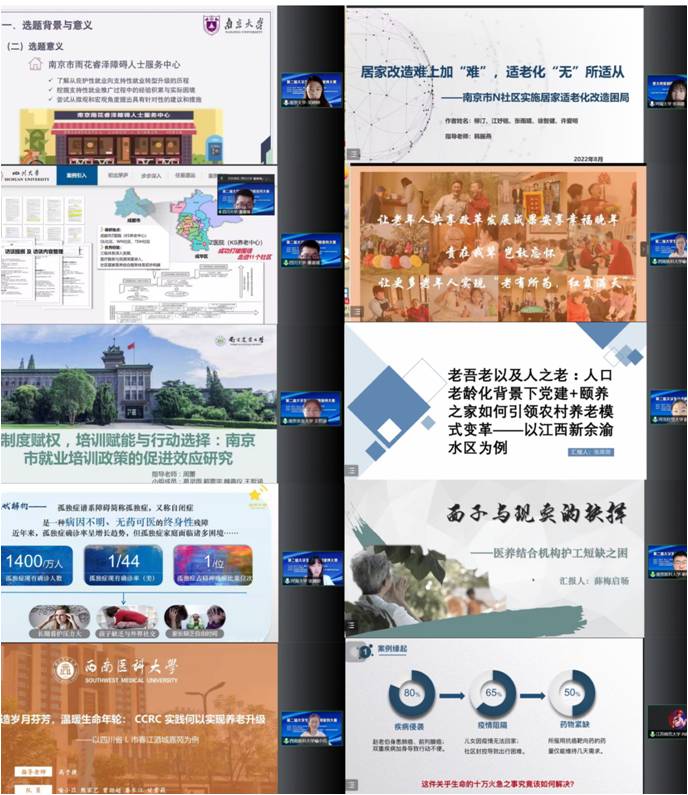 线上比赛环节由威廉希尔社会保障系副主任陈际华副教授主持。案例评选排名前十的参赛队伍分组依次进行路演,并接受友队提问及回答。这些案例作品分别是授之以“鱼”不如授之以“渔”:助残就业模式的转型升级——以南京市“雨花睿泽”机构为例(南京大学);颐养天年:“医”何以嵌入社区居家养老服务?——以成都市Z医院为例(四川大学);制度赋权,培训赋能与行动选择:南京市就业培训政策的促进效应研究(南京农业大学);听见“星星”的“回声”——孤独症家庭喘息日服务(williamhill威廉希尔);西南医科大学酿造岁月芬芳,温暖生命年轮:CCRC实践何以实现养老升级——以四川省L市春江酒城嘉苑为例(西南医科大学);老吾老以及人之老:人口老龄化背景下党建+颐养之家如何引领农村养老模式变革——以江西新余渝水区为例(河北经贸大学);面子与现实的抉择——医养结合机构护工短缺之困(南京医科大学);从“紧急配药”看社会工作介入应急救助——以昆山市L社工机构为例(江苏师范大学);居家改造难上加“难”,适老化“无”所适从——南京市N社区实施居家适老化改造困局(williamhill威廉希尔);敢问路在何方——江苏省老年医院不同医养合作模式的探索与实践(南京医科大学)。参赛队员们一方面精心展示案例作品场景及分析依据和论证,一方面围绕案例主题与内容积极精准回应友队问题,双方唇枪舌战,你来我往,情绪高涨,场面和谐激烈。赛出了知识,赛出了能力,也赛出了友谊!