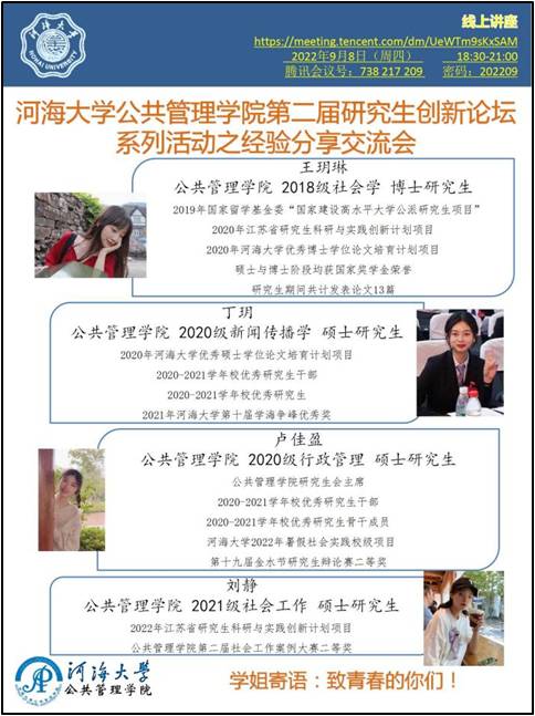 邀请公司4位高年级的博士/硕士研究生,分享各类科研项目申报与学术研究经验,如国家留学基金委“国家建设高水平大学公派研究生项目”、江苏省研究生科研与实践创新计划项目、williamhill威廉希尔优秀博士/硕士学位论文培育计划目、williamhill威廉希尔暑期社会实践校级项目等。