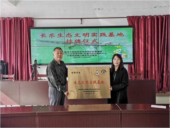为进一步深化校地合作,助力乡村振兴,推进生态文明建设,2022年11月24日上午,“长乐生态文明实践基地”挂牌仪式在安徽省南陵县籍山镇长乐村顺利举行。公司党委副书记朱志梅教授、副经理陈涛教授、社会学系主任顾金土教授出席了挂牌仪式,芜湖市委政法委三级调研员、籍山镇长乐村党委第一书记、驻村工作队队长邢毅,安徽扬子鳄国家级自然保护区管理局南陵保护站站长涂根军等班子成员参加仪式。南陵县乡村振兴局党组成员、副局长管健应邀出席挂牌仪式。