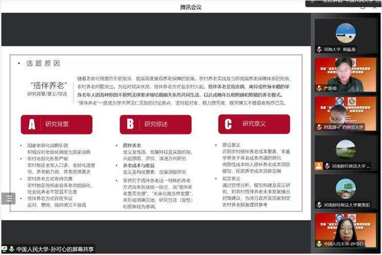 公司韩振燕教授指导、劳动与社会保障专业2022届本科毕业生(现在中国人民大学老年学专业攻读硕士研究生)孙可心同学撰写的《农村搭伴养老方式存适价值调查报告——以河北省张北县S村为例》被评为“优秀调查报告”并在大会上分享交流。孙可心同学的调查报告聚焦于“农村搭伴养老”,通过实地调研获取一手资料,基于扎根理论分析识别搭伴养老的成本收益并进行测算模型的建构,最终得出农村搭伴养老具有经济合理性,并提出促进其良性发展的对策建议。广西师范大学肖富群教授肯定了孙可心同学扎实的理论基础和实践能力,并且认为选题体现出了强烈的社会责任感和人文价值关怀,肖教授特别提出,孙可心同学能够运用扎根理论进行模型构建对访谈资料进行处理的方法值得肯定。