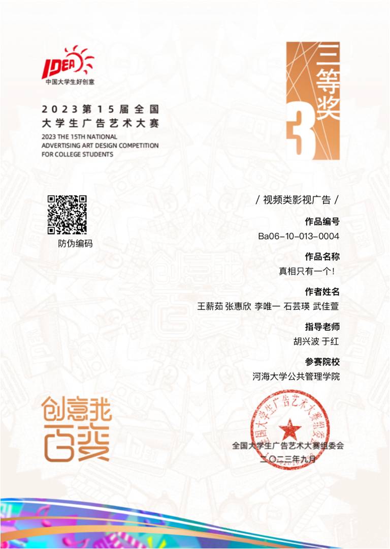 2022级播音与主持艺术专业王薪茹团队的视频类影视广告作品《真相只有一个!》获全国总评审三等奖。