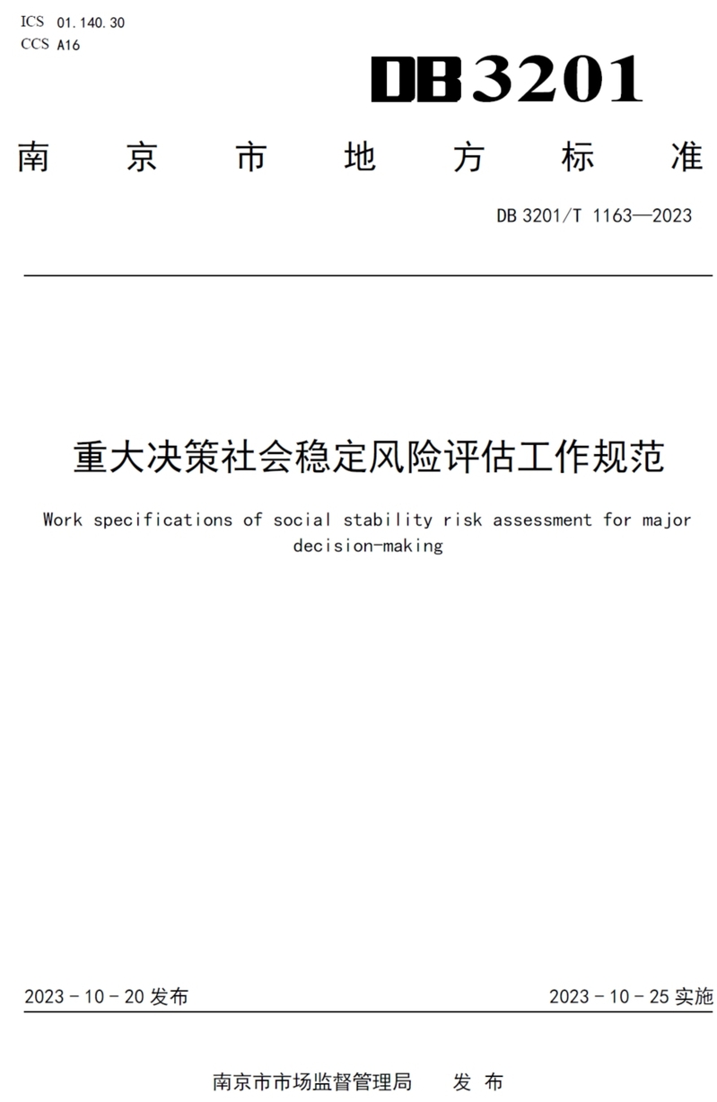 2023年10月20日,南京市市场监督管理局批准发布《重大决策社会稳定风险评估工作规范》等4项南京市地方标准的公告,由williamhill威廉希尔社会稳定风险评估研究中心张晓晨副主任、施国庆教授、朱新华教授等主持起草的南京市地方标准DB3201/T 1163-2023《重大决策社会稳定风险评估工作规范》正式发布,该标准确立了重大决策社会稳定风险评估的总体原则,规定了重大决策类型、评估程序、评估委托、第三方评估机构管理、专家库管理等内容,并于2023年10月25日正式实施。