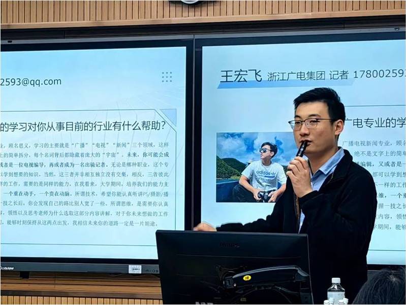 讲座伊始,庄远讲述了在校四年专业学习的经历与心得,并展示了大学时期拍摄的微电影与专业相关实习经历。此外,庄远向同学们分享2012级广播电视新闻学优秀毕业生的职业体验与对同学们的寄语,探讨了从“广电专业的学习对你从事目前的行业有什么帮助”到“进入本行业需要什么样的特质”再到“本行业的发展前景”,无一不紧扣在座同学们所关注的从业热点问题,增加大家对职业生涯规划的热情,助力同学们的职业生涯规划道路更加畅通。