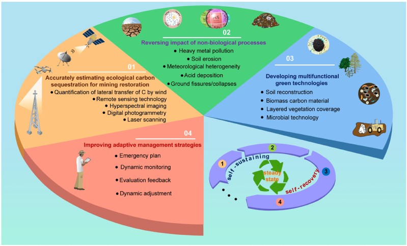该研究以全生命周期和适应性管理为切入点,指明支撑未来退化矿区生态碳汇持续提升的方向和关键技术:①准确估算矿区修复生态碳汇。精准量化不同时空尺度矿区碳平衡的变化,确定优先修复或实施修复项目的位置,并实现精准预测与监测;②扭转非生物过程的影响。将酸沉降、气候变化等非生物过程引起的矿区碳失衡降至最低,了解非生物过程对矿区碳循环的相对贡献;③开发多功效的“绿色”技术。协调土壤重构、生物质碳材料、分层植被覆盖和碳基因定向筛选等技术,在短时间内最大化矿区修复的固碳效应,实现高碳汇的矿山近自然演替;④完善适应性管理策略。依据矿山恢复程度的衡量与紧急方案的应对,建立综合和整体的适应性管理框架和行动指南,促使矿区生态系统恢复达到稳定的自我维持、自我复原的状态。