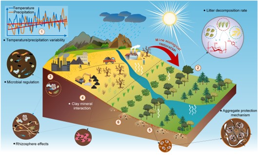 该研究耦合气候-土壤-植被-微生物互作过程,阐述了植被光合作用/光合碳分配、植物根系分泌物和植物死亡残体输入、团聚体保护、黏土矿物结合和微生物代谢及碳转化等矿区生态修复碳汇形成的复杂机制(图2)。为应对全球气候变化和碳中和愿景下矿山生态修复决策和固碳增汇最大化提供理论依据。