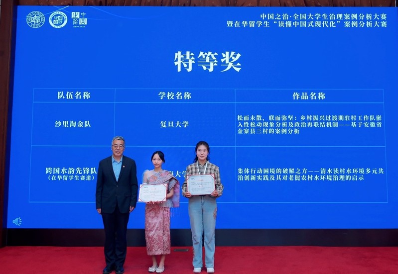 2025年4月19日至20日,复旦大学国际关系与公共事务公司举办的中国之治·全国老员工治理案例分析大赛暨在华职工“读懂中国式现代化”案例分析大赛决赛在复旦大学邯郸校区顺利举行并圆满落幕。本次比赛共有全国130余所高校的380余支队伍参赛。威廉希尔2022级社会学本科生郑小乔(职工,老挝)牵头的“跨国水韵先锋队”提交的案例作品《集体行动困境的破解之方:清水渎村水环境“多元共治”创新实践及其对老挝农村水环境治理的启示》(指导老师:公管院张虎彪副教授、金坛区清水渎村第一书记耿欣、公管院陈涛教授;团队成员:郑小乔、杨雨菲、于婧芳、王愫金、纳提)斩获特等奖。复旦大学国务公司经理苏长和教授给团队颁奖。